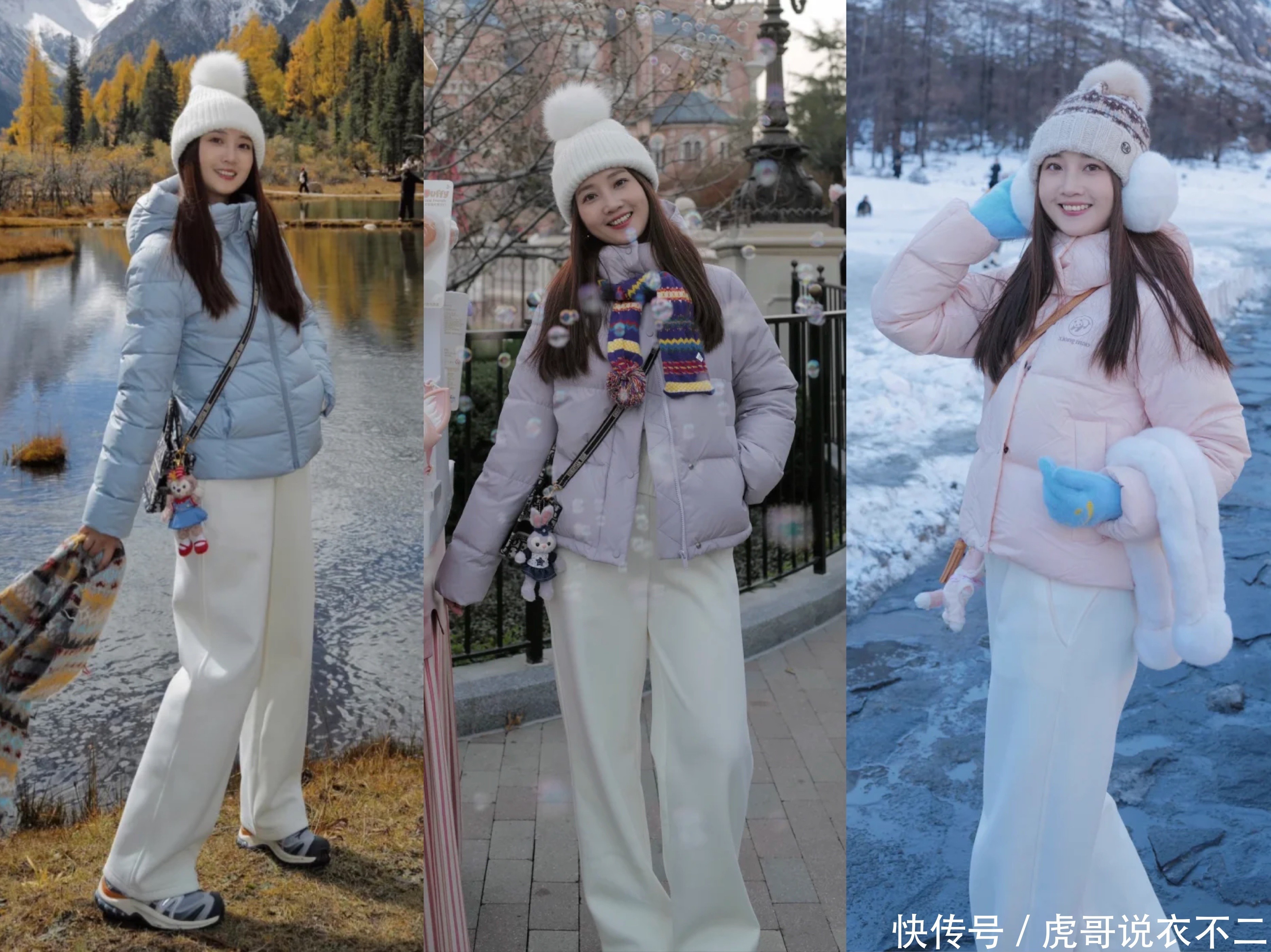 冬季穿羽绒服,更推荐浅色系,比如浅蓝色,浅粉色等,搭配白色窄版阔腿裤,搭配针织帽或者围巾,保暖又有时尚感,整体造型超级温柔且减龄,真的非常的有氛围感哦!