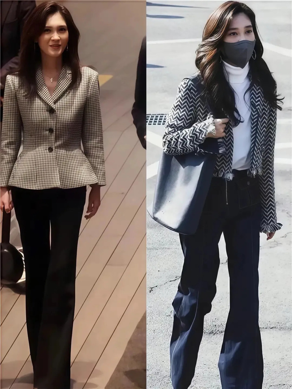 其实你认真观察身边非常有气质,穿衣比较大气的女性,你会发现她们不会选择紧身裤、我很酷之类的来和衣服搭配,而是选择微宽松的款式,像李富珍用黑白格纹高腰收腰款的西装搭配黑色的微喇叭直筒长裤,这样的造型就很贵气。