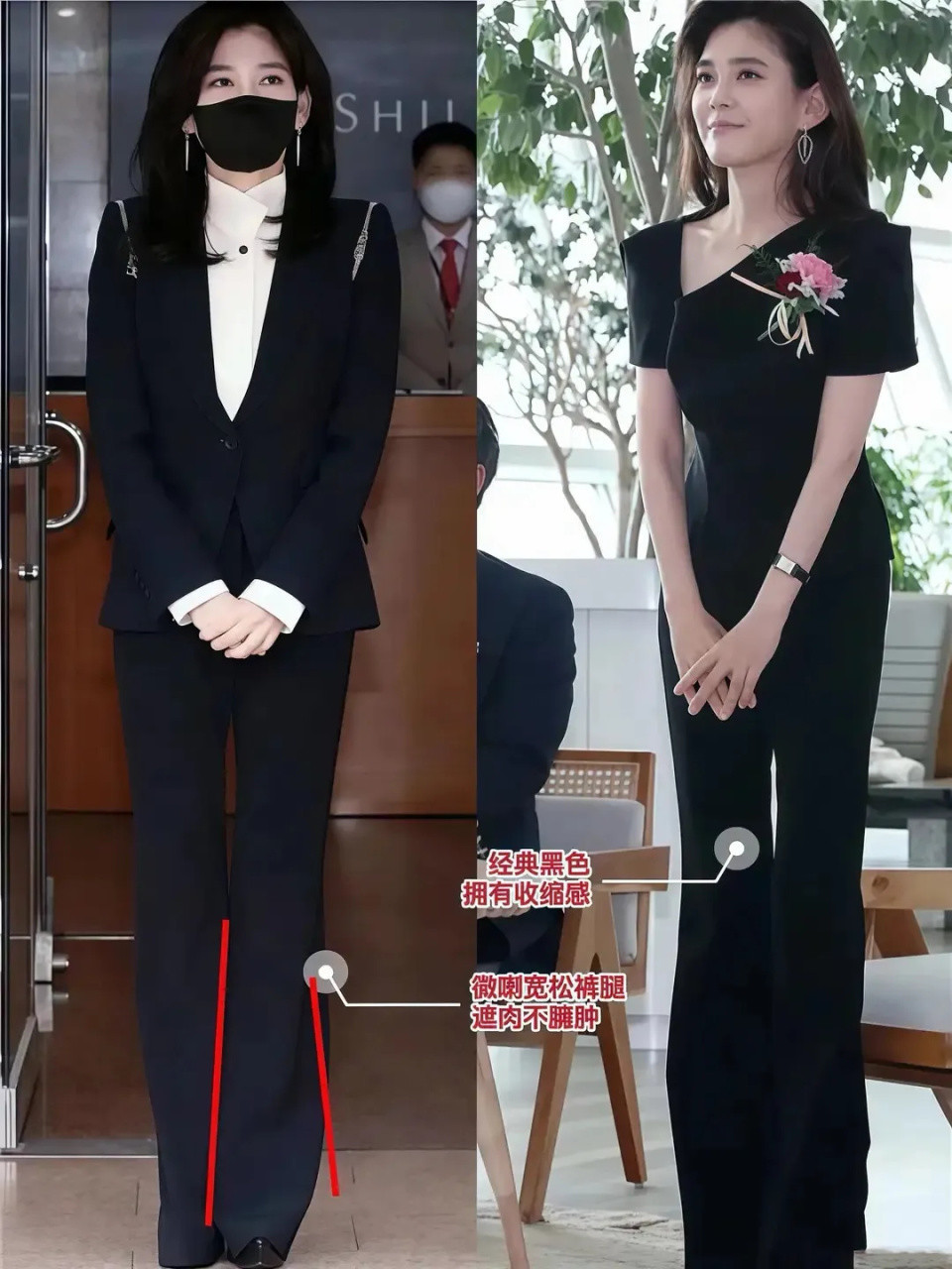 李富真选择经典的黑色西裤,自带视觉收缩感,微喇叭裤型藏着巧思,裤管宽松地掠过腿侧,恰到好处的遮肉显瘦,丝毫不见臃肿。