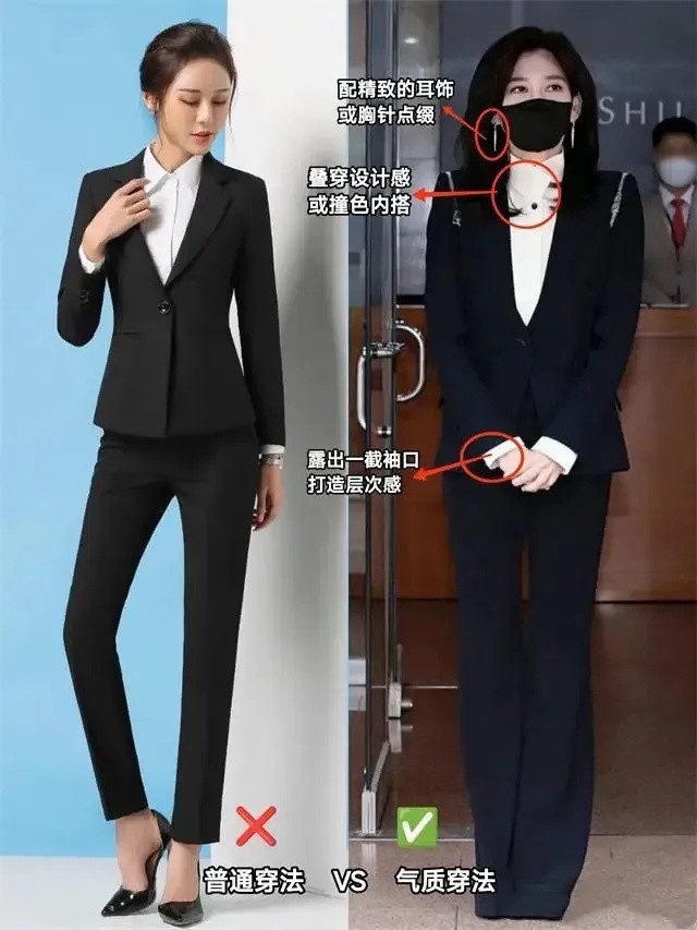 我们应该选择一点精致的耳饰或者是胸针来点缀里面的衬衫,可以采用叠加设计感的衣服,或者是撞色内搭,把内搭的衬衫袖口露出来一点打造层次感,这样才是我们想要的气质穿法。