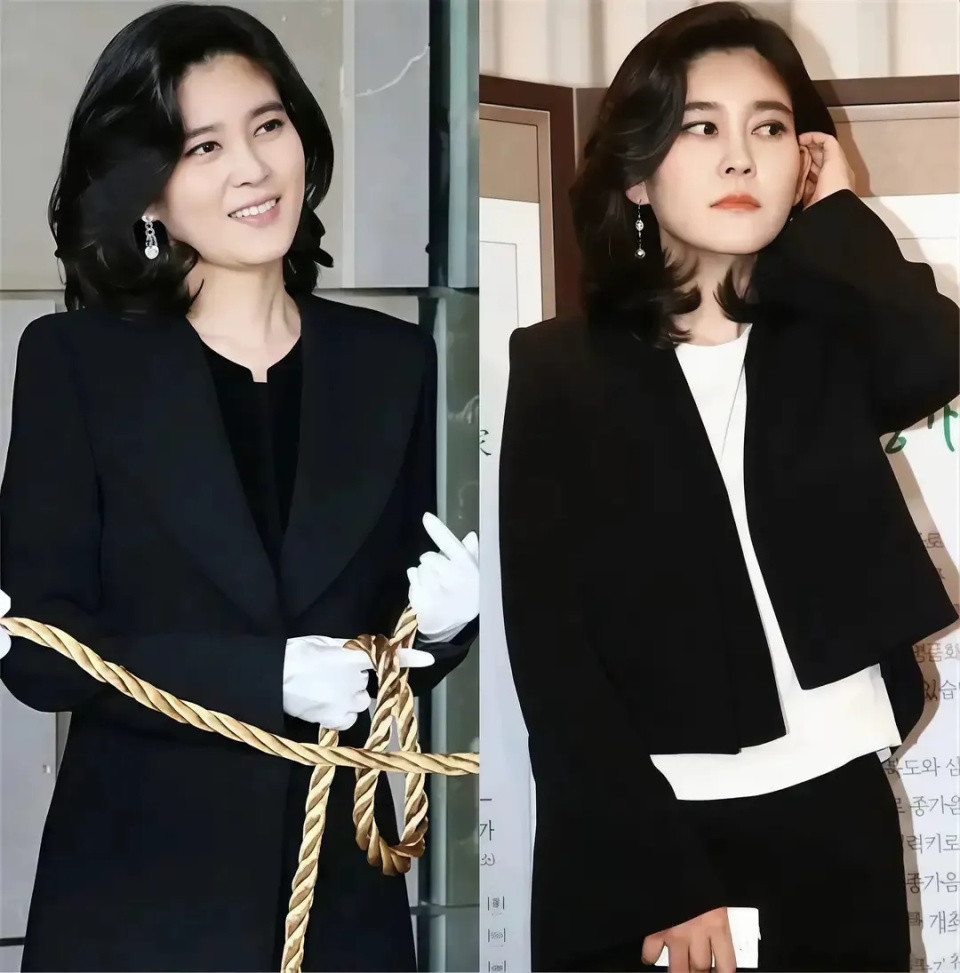 像三星长公主李富珍,直接选择黑色的西服套装,内搭白色打底 T 恤,或者是黑色针织打底衫,加上白色珍珠耳坠,耳畔点缀的白色珍珠耳坠,是点睛的温柔。这一抹白与一身黑碰撞,让自信里多了几分雅致,简约便显高贵。
