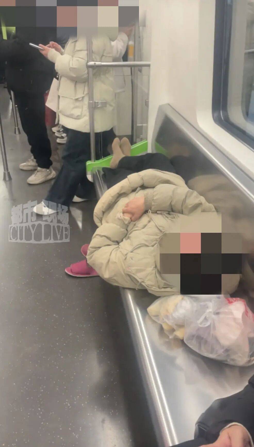 网友提供的视频显示:这位女乘客脱鞋横躺座椅,头部枕在一袋衣服上。但与此同时,车厢里还站了多位市民,没有座位。